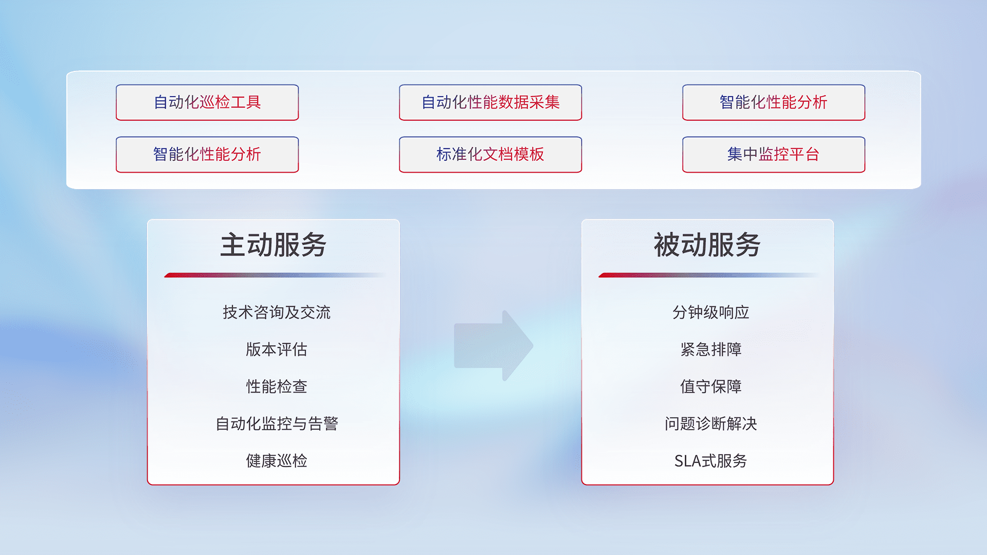智能化工具和标准化文档,,保障服务质量,,提供主动服务(包含技术咨询、、、版本评估、、、性能检查、、自动化监控与告警、、、健康巡检)和被动服务包含(分钟级响应、、、紧急排障、、、值守保障、、、、问题诊断解决、、、、SLA服务)。。。