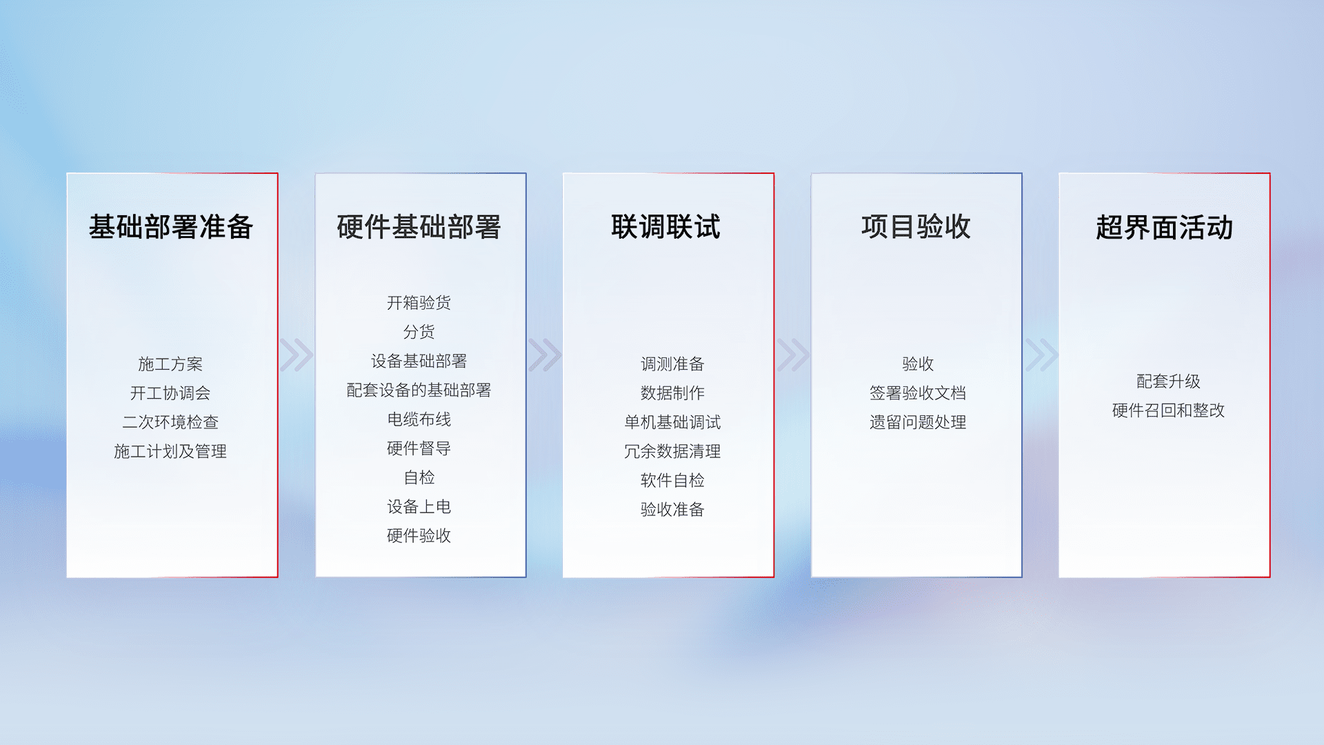 从基础部署准备、、、、硬件基础部署、、、、联调联试、、、、项目验收、、、越界面活动的全过程可追溯,,,,保证施工质量和进度。。。。